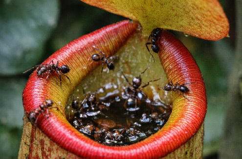 보르네오섬 키나발루국립공원에 서식하는 네펜데스는 척박한 환경에서 살아남기 위해 독특한 생존 방식을 선택했습니다. 이 식충식물의 포충낭은 잎 끝에서 시작되어 보름에서 한 달에 걸쳐 완성되며, 화려한 색깔과 맛있는 냄새로 곤충을 유혹합니다. 주머니 입구에는 개미가 좋아하는 꿀과 양분이 잔뜩 묻어 있지만, 이것은 달콤한 죽음의 덫일 뿐입니다. 입구는 동그랗게 말려 있어 쉽게 미끄러지고, 일단 빠지면 내부의 미끄러운 벽 때문에 탈출이 불가능합니다.