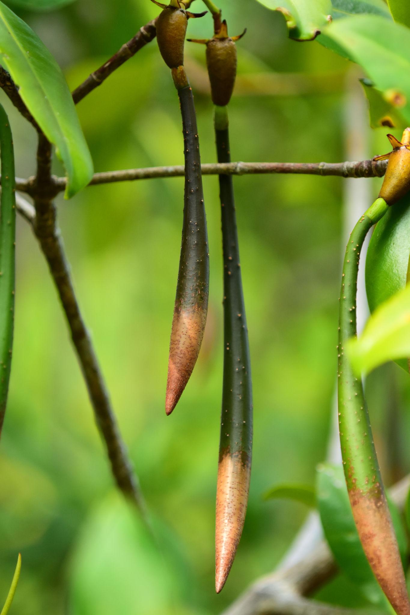 맹그로브의 씨앗 분산 전략은 더욱 독특합니다. 강과 바다가 만나는 곳에서 사는 이 맹그로브는 척박한 환경에서도 씨앗이 살아남을 수 있도록 기발한 전략을 구사합니다. 이 맹그로브는 씨앗이 생기면 바로 떨어뜨리지 않습니다. 씨앗은 상당 기간 어미 나무에 붙어서 자랍니다. 이렇게 거꾸로 매달린 채 길게 싹을 내려 새끼 나무가 되면 준비를 합니다. 새끼 나무들은 진흙 펄에 떨어져 그대로 박힙니다. 그리고 물에 흘러가지 않게 보호해 주는 어미 주변에서 뿌리를 내립니다. 밀물과 썰물이 교차하는 곳에서 살아남아 다음 세대를 이어가는 맹그로브만의 생존 전략입니다.